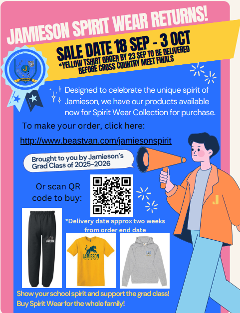 Grade 7 Fundraiser’s Spirit Wear is BACK! Order @ http://www.beastvan.com/jamiesonspirit (See Sizing Below!)